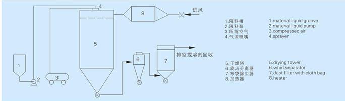 潔凈空氣加熱后進入干燥塔,在塔內熱風中用二流體(或三流體)噴嘴將各種料液物化成微小液滴,與熱風進行快速熱交換,蒸發掉液料中的水份(或溶劑),并隨熱風排出,得到粉狀產品。